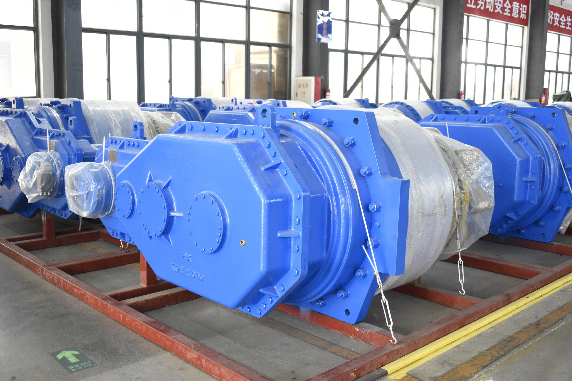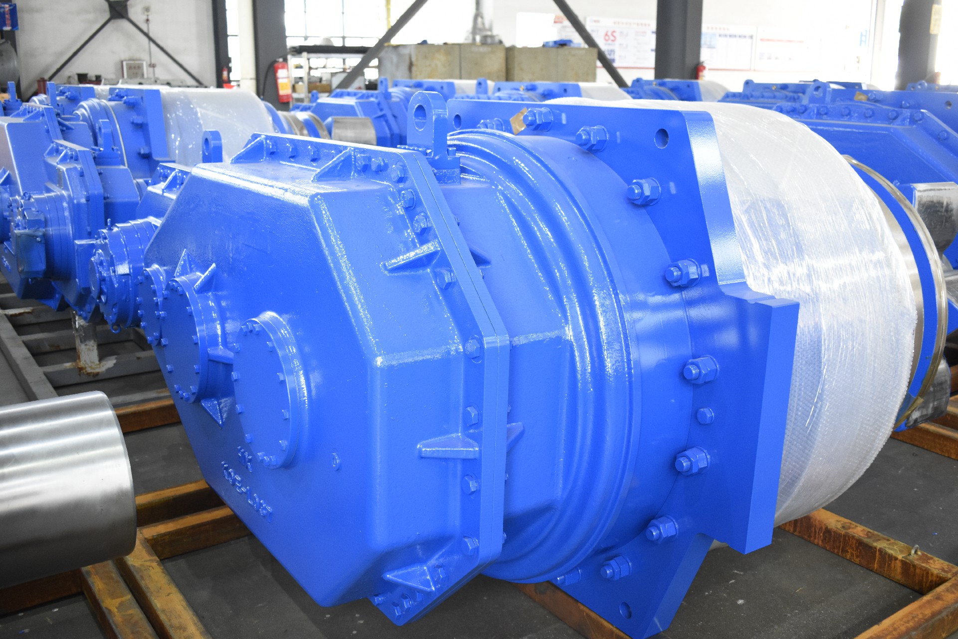 一套齒輪齒條升降系統(tǒng)一般由多個升降單元及電氣控制系統(tǒng)構(gòu)成,升降單元數(shù)量根據(jù)平臺所要求的舉升能力和平臺總體要求加以確定。升降單元由行星減速箱、平行減速箱、爬升齒輪、電機、制動器等部件組成。動力通過馬達驅(qū)動齒輪減速箱,傳遞給與樁腿齒條嚙合的爬升齒輪帶動平臺完成升降。按照驅(qū)動方式,齒輪升降系統(tǒng)分為電機驅(qū)動齒輪齒條式和液壓驅(qū)動齒輪齒條式。
