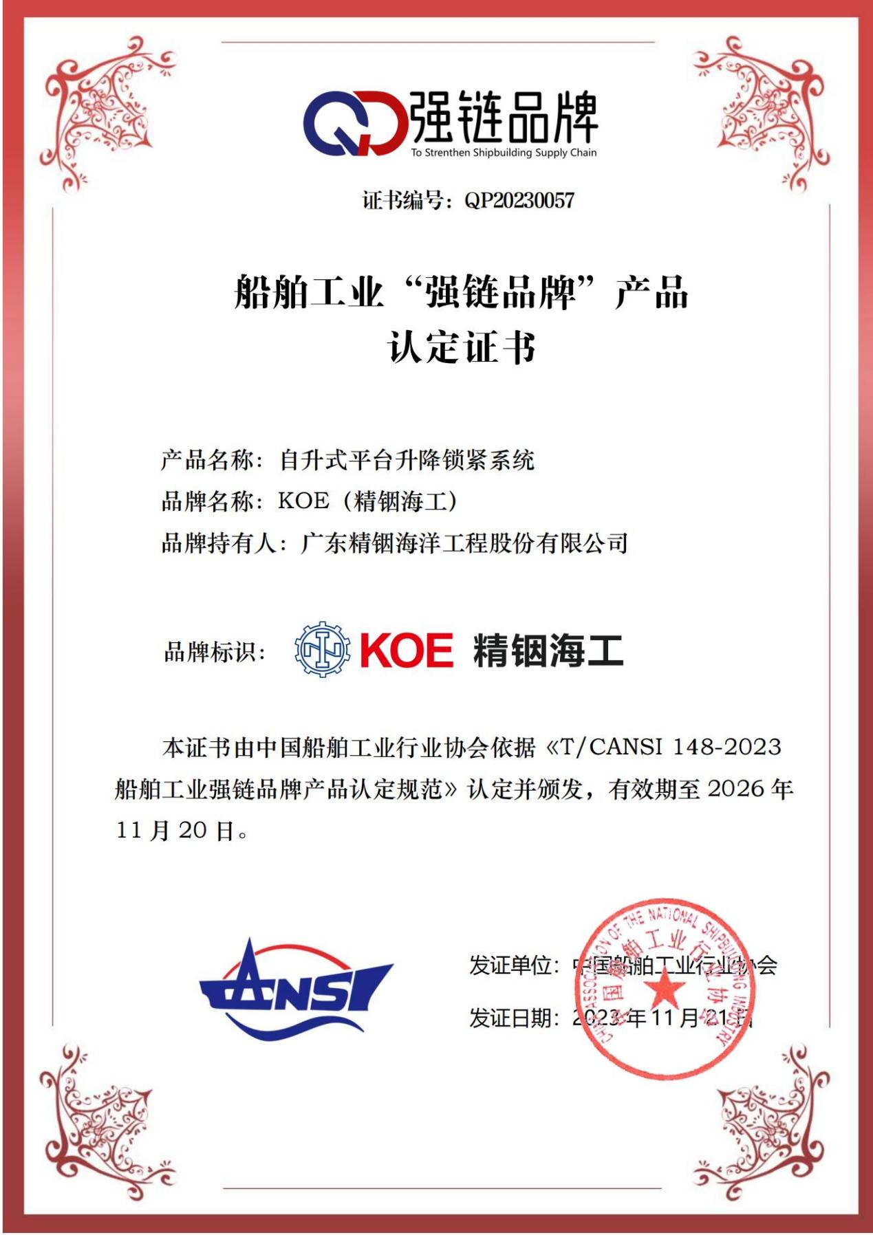 經(jīng)中國(guó)船舶工業(yè)行業(yè)協(xié)會(huì)的專家評(píng)審,精銦海工的“自升式平臺(tái)升降鎖緊系統(tǒng)”成功入選船舶工業(yè)“強(qiáng)鏈品牌”產(chǎn)品目錄,產(chǎn)品的卓越性能和可靠性再次得到了權(quán)威認(rèn)可,彰顯了精銦海工在船舶工業(yè)領(lǐng)域的競(jìng)爭(zhēng)力和影響力。