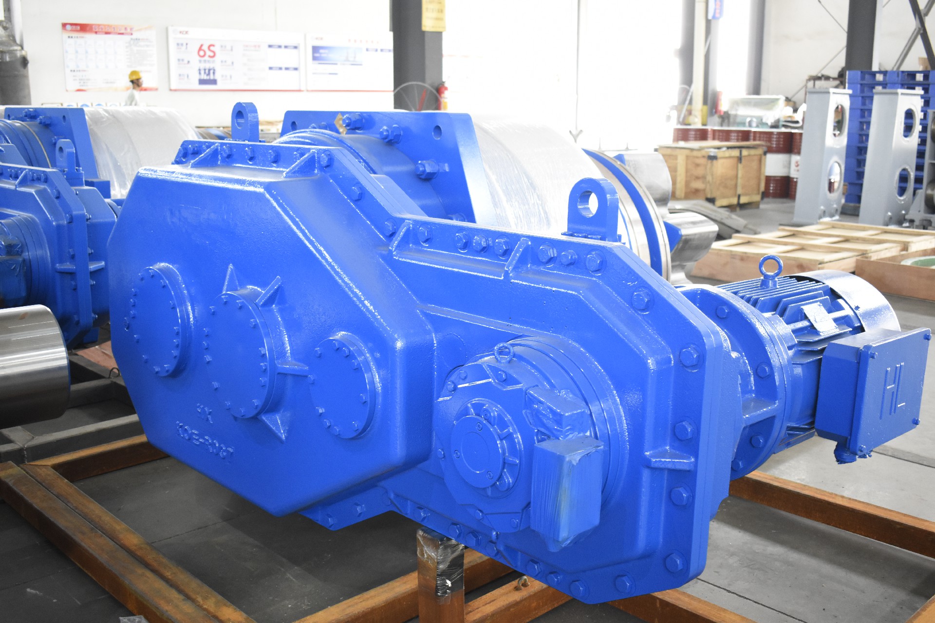一套齒輪齒條升降系統(tǒng)一般由多個升降單元及電氣控制系統(tǒng)構(gòu)成,升降單元數(shù)量根據(jù)平臺所要求的舉升能力和平臺總體要求加以確定。升降單元由行星減速箱、平行減速箱、爬升齒輪、電機、制動器等部件組成。動力通過馬達驅(qū)動齒輪減速箱,傳遞給與樁腿齒條嚙合的爬升齒輪帶動平臺完成升降。按照驅(qū)動方式,齒輪升降系統(tǒng)分為電機驅(qū)動齒輪齒條式和液壓驅(qū)動齒輪齒條式。